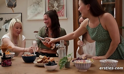 Inexperienced lesbian orgy with two ebony chicks and two white hoes