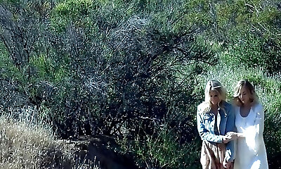 Mature brunette lesbian eats a pussy outdoors