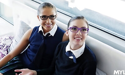 Thirsty schoolgirl pulverizes with hefty cock than comes to her lesbian BFF